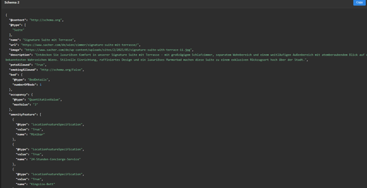 Der von Maschinen wie dem Browser oder Suchmaschinen interpretierte Code enthält hier jedoch nähere Beschreibungen zur betrachteten Suite wie die Verfügbarkeit eines 24-Stunden-Concierge-Services, einer Minibar oder einer Terrasse mit Stadtblick. All dies sind Dinge, die für potenzielle Käufer*innen durchaus interessant sind und auch Gegenstand der Suche sein könnte.
